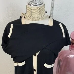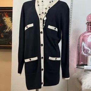 J.Crew Chic cardigan with black and cream contrast. Features button-down front and pocket. Perfect for layering.