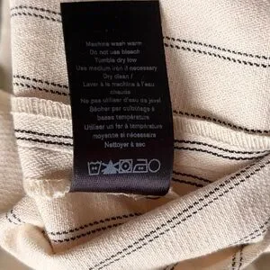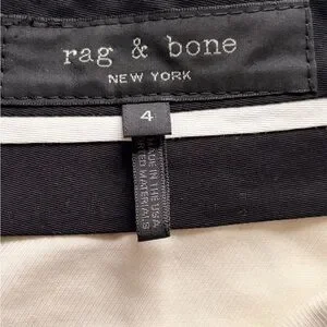Clean, structured, modern tailoring. These Rag & Bone pinstripe trousers feature a crisp ivory base with fine black stripe, mid/high rise fit, and subtle raw frayed hem for that understated elevated edge.