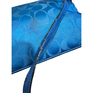 A vibrant blue messenger-style crossbody bag featuring the iconic Coach signature jacquard pattern in durable nylon with leather trim. Coach was founded in 1941 as a family-run workshop in a Manhattan loft. This specific model represents the brand's shift toward lighter, contemporary materials like nylon, which were introduced to cater to active urban lifestyles while maintaining the classic luxury aesthetic associated with the Horse and Carriage logo. 11”x8”x3” with24” strap drop approximately. Needs interior cleaning upper area near opening. Strap has some wear as noted in pictures.