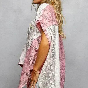 The V-neck sleeveless oversized fit top in lace is a chic and on-trend piece that embodies effortless style. Featuring raw edge detailing and a pointed solid pattern, this top offers a unique and modern touch to your look. The sleeveless design adds a touch of sophistication, perfect for warmer weather or layered with a jacket. Embrace the oversized fit for a relaxed yet stylish silhouette that can be dressed up or down. Elevate your wardrobe with this standout lace top that combines comfort and fashion-forward design.