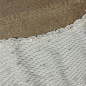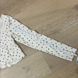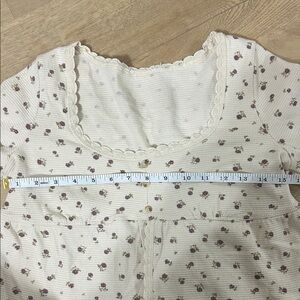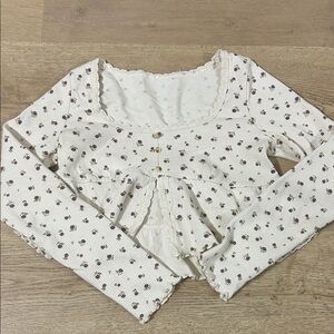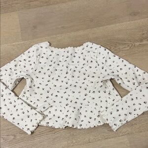 Charming cream long sleeve babydoll top with floral pattern. Features a scoop neckline and button details. This cute babydoll top has cute ruffles on the end of both the sleeves and the hem of the bottom part of the top. It is also a cropped top with a cute open feature in the front below the three buttons. No longer has a tag and I’m not sure the exact size but it fits like a size medium.