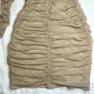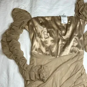 Brand new with tags, I wore for literally an hour to take the pics as shown. Extremely flattering as top is corset style (no boning) and the rest is ruched fabric, the bottom front also comes up slightly in middle. No rips, stains, tears or damages. No fading or pilling. Colour is champagne. Stretchy.