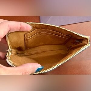 Chic lime pattern printed on a cream background on Coach corner zip wristlet. Ideal for casual outings. Easy to carry.