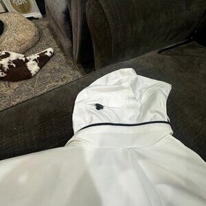 White with navy accents, waterproof performance fabric (Rain.RDY), reflective stripes, zippered pockets, hood, lightweight but protective.