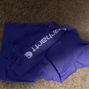 Carhartt kids pullover hoodie in a vibrant purple hue. This durable sweatshirt features the iconic Carhartt logo on the chest and a bold graphic print running down the left sleeve. Designed with a classic kangaroo front pocket and a comfortable hood, it offers a regular fit perfect for everyday wear or outdoor activities. The ribbed cuffs and hem provide a secure fit while maintaining the brand's signature rugged style.excellent condition.