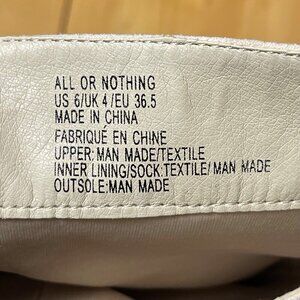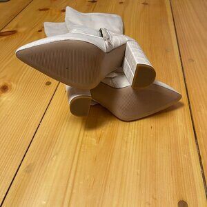 Knee-high boots, JustFab shoes, white boots, buckle boots, stylish shoes, textured heel, faux leather, women's footwear, size 6 boots, chic design, side zipper, fashion boots, elegant shoes