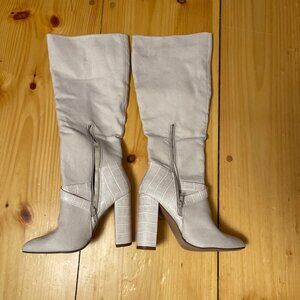 Knee-High JustFab Ivory Textured Heel Boots With Buckle Sz 6 Block Heel Alligato