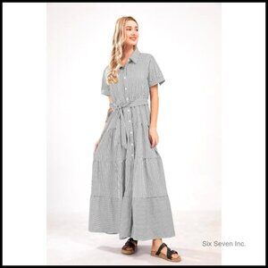 Casual Short Sleeve Button Down Tie Waist Ruffled Maxi Shirt Dress