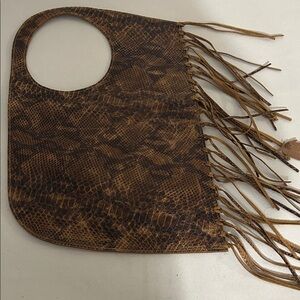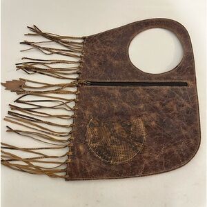 Mixed embossed leather artisan made fringed bag. One of a kind bespoke. This is a“ flat “ bag with one mid zip pocket and lower 3/4 moon outer pocket. Excellent condition.