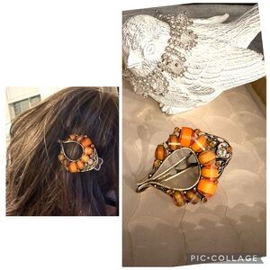Beautiful vintage hair barrette crafted on an ornate antique brass filigree base and embellished with warm amber and burnt orange glass beads with sparkling rhinestone accents. The rich brass tone paired with autumn hues gives this piece a true boho / retro statement look.