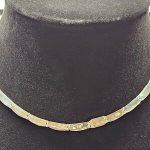 Striking vintage Mexican necklace crafted in .950 sterling silver with sleek black onyx inlay panels. This is a structured, geometric collar design with strong modernist influence — bold yet refined.