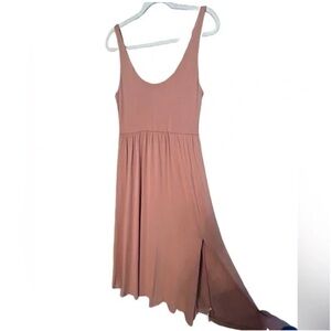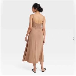 Chic tan midi dress with sleeveless design. Perfect for versatile styling.