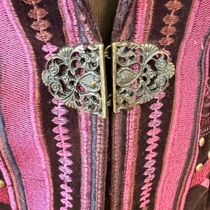 • Ornate metal clasp front closure
