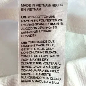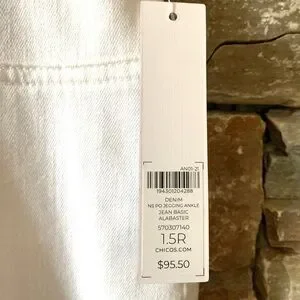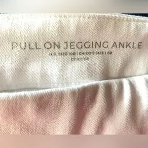 Comfortably chic and sleek, these jeggings give you the look of classic five-pocket jeans in a stretch fabric that smooths and slims. Powered by Stain-Repel, Bright-White technology, they stay white longer and repel water-based spills. Chico’s size 1.5 = M or size 10. Color is alabaster. Faux fly and faux front pockets; two back pockets. Approx. dimensions: 10.5” rise; 26” inseam.