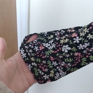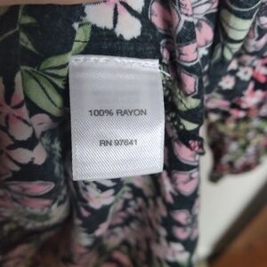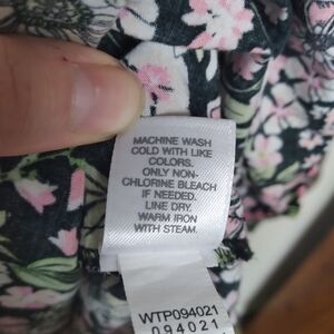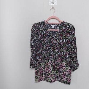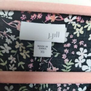 J. Jill black cottagecore floral print quarter sleeve blouse with pink and green floral print throughout
