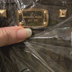 Elegant handbag with gold accents. Features a textured brown design. Ideal for stylish outings.