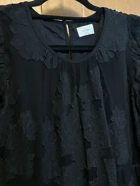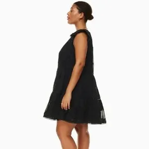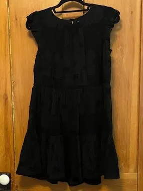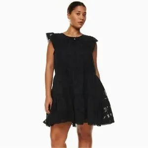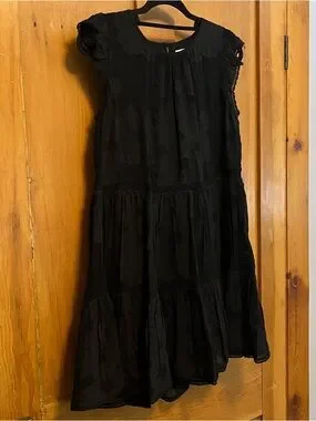This is a tiered babydoll dress with short flutter sleeves and decorative scalloped edges. It’s cut from semi-sheer jaquard fabric.