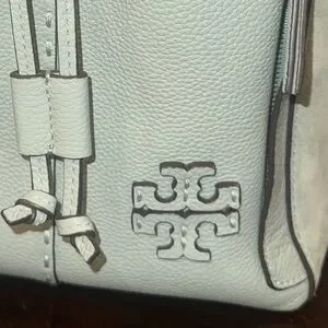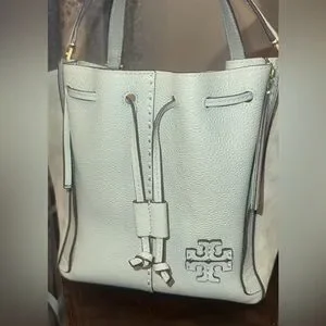 Gorgeous Tory Burch shoulder bag in light green/blue leather. Features a stylish drawstring closure and embossed logo. This bag is absolutely gorgeous! It’s the perfect size. I will also put it in the Tory dust bag and package it very carefully.