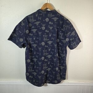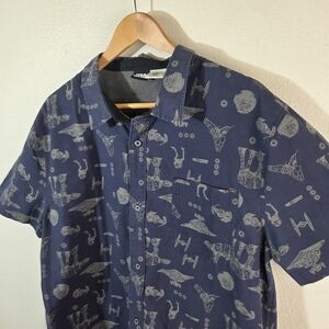 DETAILS: • Brand: Star Wars (Licensed) • Size: XL • Color: Navy Blue • Pattern: All Over Star Wars Spaceship Print • Sleeve Length: Short Sleeve • Closure: Button Front • Material: 65% Polyester / 35% Cotton • Condition: Excellent – no stains, holes, or damage