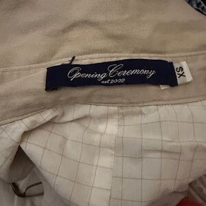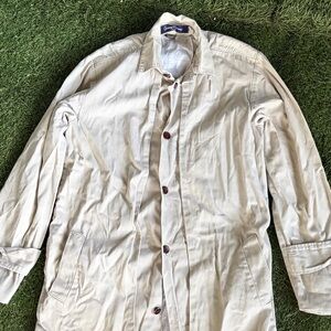 Y2K minimalist trench coat. Cream colored buttons up on the front, Fully lined. Not so thick and not to thin throw on piece. Has a cool desing on the front of double fabric layering. Tagged an XS. I feel it can fit up to a medium. I’m a small and it fits comfortably with room.
