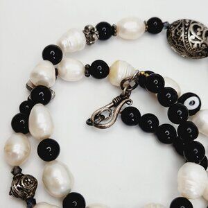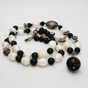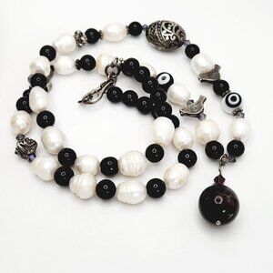 Genuine Pearl & Onyx Beaded 925 Sterling Silver Evil Eye Bird Cross Necklace