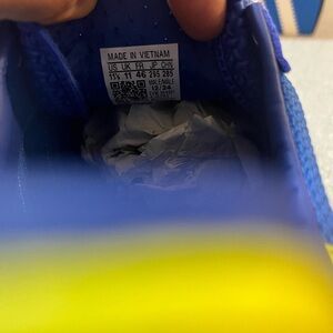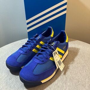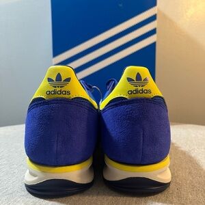 Bold Adidas trainers in royal blue with yellow accents. Ideal for everyday style.
