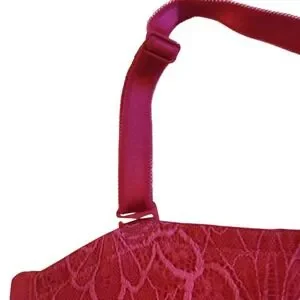 Torrid Curve unlined balconette bra in a vibrant dark pink or magenta lace. This romantic piece features intricate floral lace throughout the cups and wings, complemented by delicate scalloped edges. Designed with underwire support and adjustable satin-finish straps, it offers a comfortable and flattering fit. The back is finished with a wide lace band and a four-row hook-and-eye closure for added stability and smoothing.