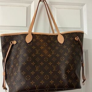 Stylish tote with iconic monogram pattern. Features tan leather handles.