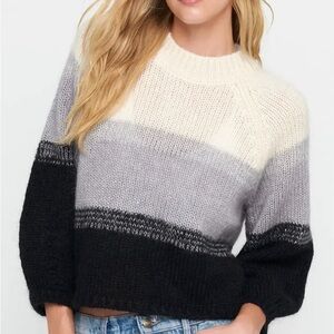 Stay cozy and stylish with this colorblock knit sweater. Featuring a blend of cream, gray, and black, this sweater is perfect for any casual outing.