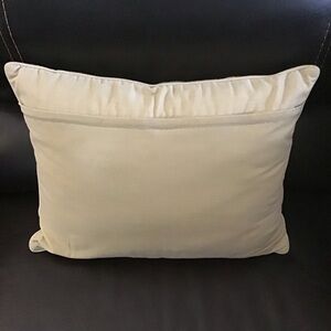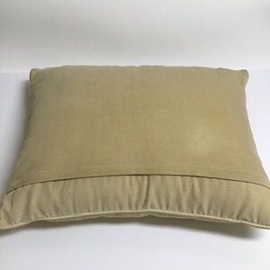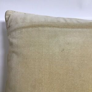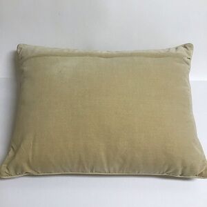 Large, rectangular throw pillow is in overall excellent condition with just a slight mark/spot on the back of the velvet cover (please see all photos for condition). Pillow is clean; no odors, hidden zipper cover, poly fill form—perfect for a beach home or cottage—100% wool, hand-crafted needlepoint with ivory/gold cotton velveteen backing.