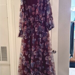 Chic long sleeve dress with a floral design. Features a deep burgundy base with blue flowers. Perfect for elegant occasions.