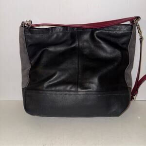✨️ Coach Park Quilted Colorblock Hobo ✨️ Style No.: F24981 ✨️ Beautiful burgundy Quilted front pocket with turnlock ✨️ Smooth black leather with dark gray suede sides and silver hardware ✨️ Interior is a beautiful burgundy color with 2 slip pockets and 1 zippered pocket and a zip top closure ✨️ Approx. Measurements: 14" L × 13" H × 3" D