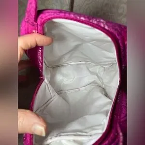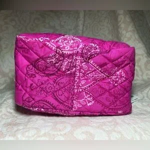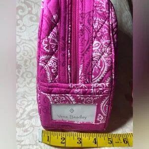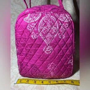 New with Tags. Stylish and vibrant, this Vera Bradley lunch bag in “Stamped Paisley” features an intricate white paisley and floral design set against a vibrant pink, quilted fabric background.