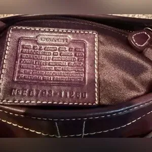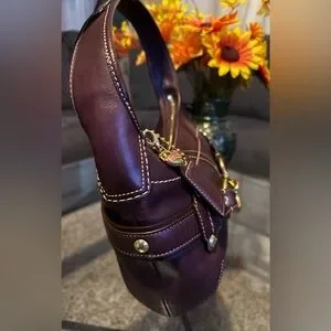 Sophisticated Coach shoulder bag in dark burgundy leather. Features gold hardware and stylish design.