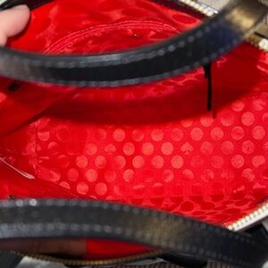 Timeless Kate SPADE dome handbag with adjustable long strap. This elegant women's handbag features a sophisticated black and cream design with red interior, perfect for any occasion. The stylish bow accent adds a touch of charm to your ensemble.