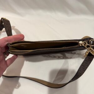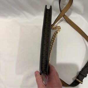 Elegant crossbody bag by Michael Kors. Features a dark brown design with a striking gold chain. Ideal for versatile styling.