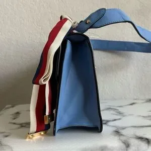 Chic Gucci crossbody in light blue leather. Features bold red and gold accents. Stylish and versatile for any occasion.