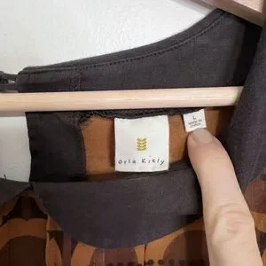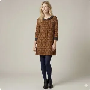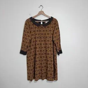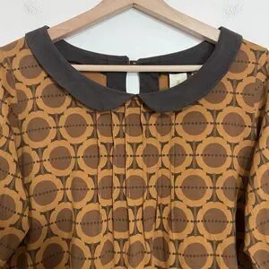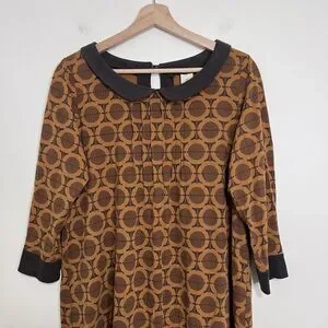 Beautiful Orla Kiely for Uniqlo tunic dress featuring the iconic retro geometric circle print in warm mustard and brown tones. Designed with a contrasting dark brown Peter Pan collar and matching sleeve cuffs. Three-quarter sleeves and a relaxed A-line silhouette make it flattering and easy to wear. Lightweight 100% cotton fabric. Back zipper closure. Perfect layered with tights and boots for fall or styled alone in spring.