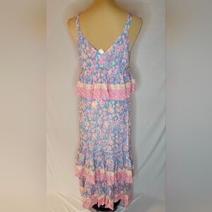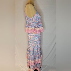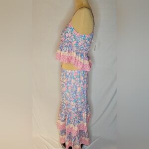 Elevate your wardrobe with this beautiful and rare two-piece set from Anthropologie's "Plenty by Tracy Reese" line, in the popular 'Meadow' print. This set features a charming blue, pink, and yellow all-over floral pattern with delicate pink lace trim details.