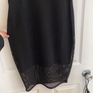 Form fitting pencil style midi length dress. Has mesh on top of a black lining. Thin straps. Side zip with hook & eye closure.