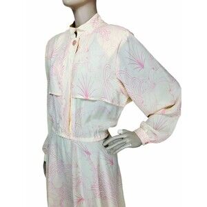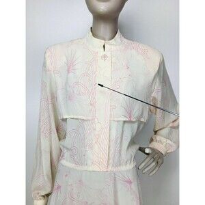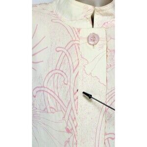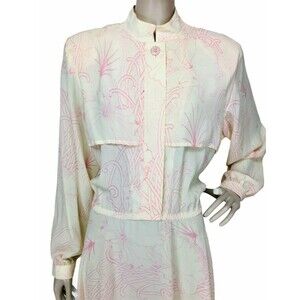 Vintage 70's/80s Leslie Fay semi-sheer vented beige with pink sketch floral print, button-front, balloon sleeves, shoulder pads (easily removed) buttons at the wrist, size 14 but can fit L/XL/XXL depending on your measurements and desired fit.