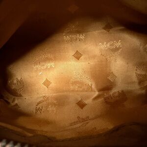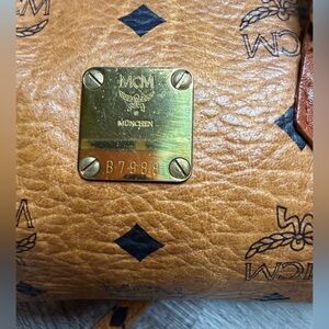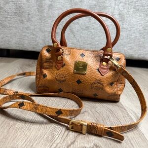 Chic MCM mini bag in cognac. Features gold hardware and iconic logo pattern. Perfect for stylish outings.