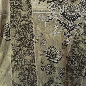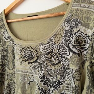 Y2K-era Vanilla Sugar top in a gorgeous muted sage green with an allover baroque-paisley floral print and rhinestone accents. 3/4 sleeves, soft stretch cotton with a fitted shape. Very Y2K boho with a romantic meets edgy vibe. Made in USA, which is less common for later Y2K garments, pointing to earlier 2000s.