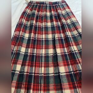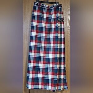 Stylish plaid tartan maxi skirt featuring a classic red, blue, and white pattern. Warm as can be and including attached belt. Some holes due to moths.