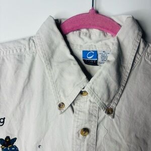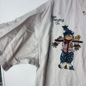 Vintage casual button down shirt with playful designs. Features a snowman and gift motifs. Perfect for relaxed occasions.