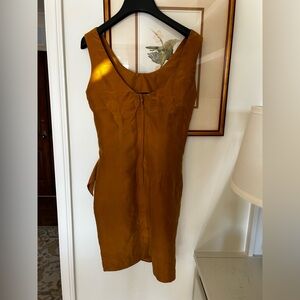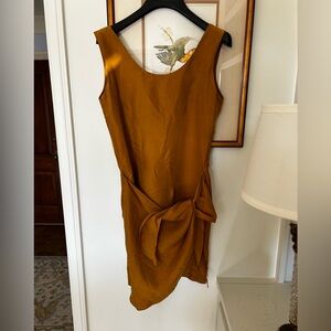 100% silk wrap dress in mustard yellow golden brown. See imperfections in photo. Sz 8 but this is vintage. Runs smaller! More like a 6. Such a beautiful dress