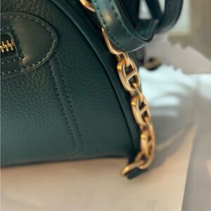 Elegant green leather handbag with gold accents. Perfect for any occasion.