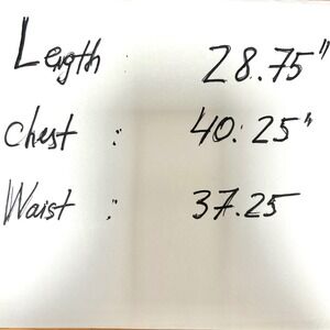 Size 12, runs tighter across chest, you may consider to size down 1 size Length 28.75", chest 40.25", waist 37.25"