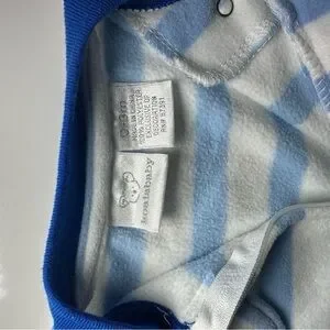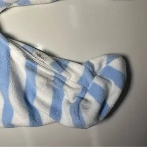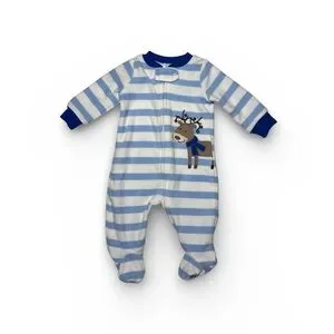 Charming footie with blue and white stripes. Features a playful reindeer applique. Ideal for comfort and style.