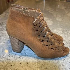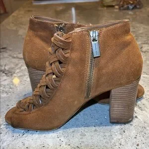 Michael Kors brown suede booties with a woven design. Perfect for stylish outings.